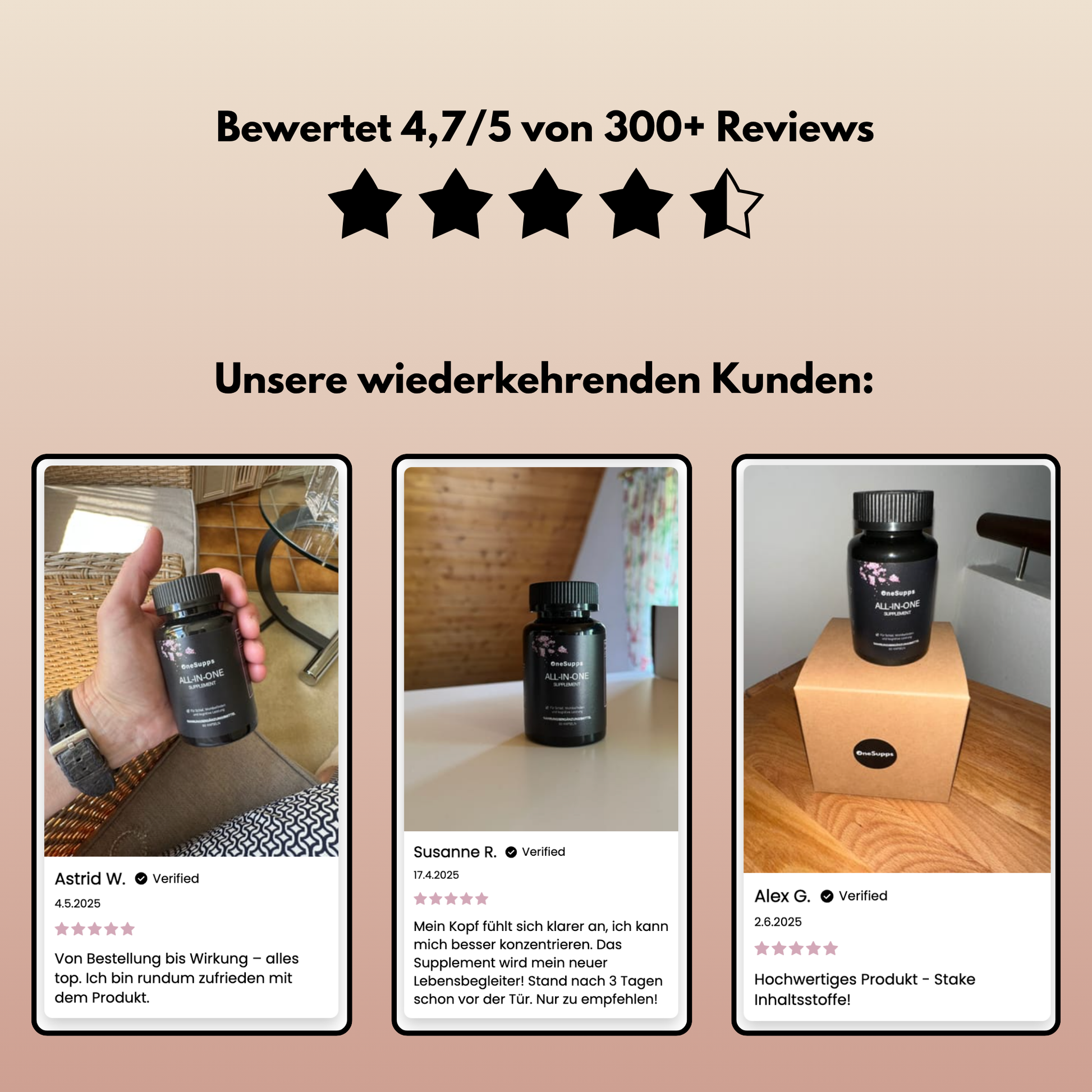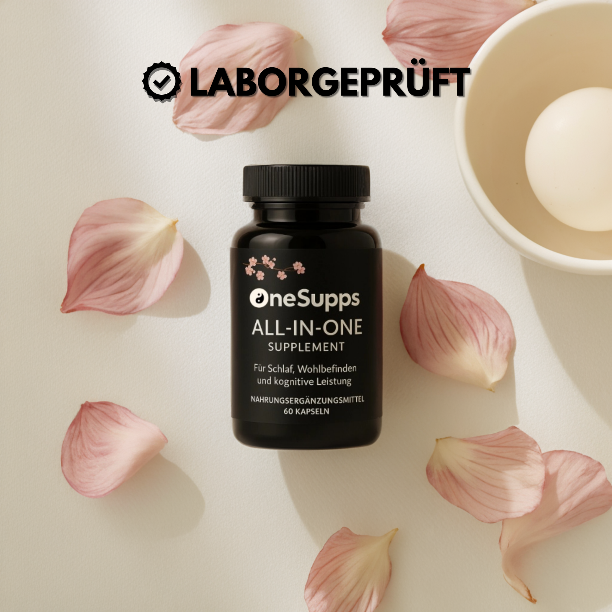 OneSupps combines eight powerful ingredients in a single, perfectly balanced supplement – for body, mind, and everyday life. Whether you want to boost your energy levels, sharpen your focus, or simply sleep better: ALL-IN-ONE from OneSupps delivers exactly what you need – every day, without any detours.